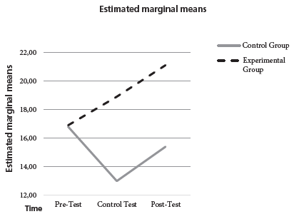The data were also tested with the help of a Mauchly’s test where a p value of 0.459 proved sphericity, one of the essential conditions to be met before executing a repeated measures test (Ho, 2006; Pituch & Stevens, 2016). When executing the repeated measures test, it was determined that, although there were significant differences in students’ oral communicative competence throughout the implementation, those differences were not equivalent for the EG and CG. Consequently, an additional test was run in order to determine if the interaction of the between-subjects factor (the group where they were placed) and the within-subjects factor (the repeated measures) had been significant. To achieve this, the coding of the repeated measures test was modified on SPSS as follows: