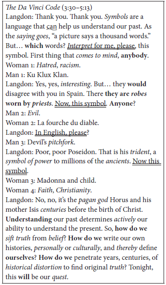 This is a good scene with which to talk about the topic of symbolism and cultures with students. This fragment focuses mostly on vocabulary (mainly racism, religion, mythology, and pop culture) and the grammar present is quite simple and within fourth-year students’ level (it is limited to how-questions, that-relative clauses, present simple and continuous, and demands), so in this case it may be more interesting and beneficial for students that the activities have a focus on meaning. The scene is very versatile; the activities arising from it could focus on current symbolism, that is, new language (like emojis and memes, which students will be familiar with), but also on the idea of multiculturalism and the relativity of images depending on how and where one has been brought up. Students could be asked to give their opinions and to write messages making use of those new ways of expressing meaning these days.