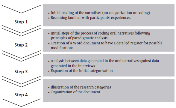 The data collection process took place in the last semester of 2019 and the first trimester of 2020. For data analysis we followed the principles of the paradigmatic approach. This approach recommends the proposition of categories (Polkinghorne, 1995, p. 14) and encourages the identification of particular occurrences within the data to relate them with the established categories to make sense of the stories. Consequently, we followed a four-step analysis: Step 1 consisted of becoming familiar with participants’ experiences; Step 2 was related to the initial process of coding the narratives in the software Atlas.TI; Step 3 centered on expanding the initial categorization and analyzing data stemming from the oral narratives along with the narrative interviews; and Step 4 focused on illustrating the research categories emerging from the overall process of data analysis (see Figure 1).