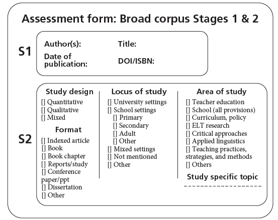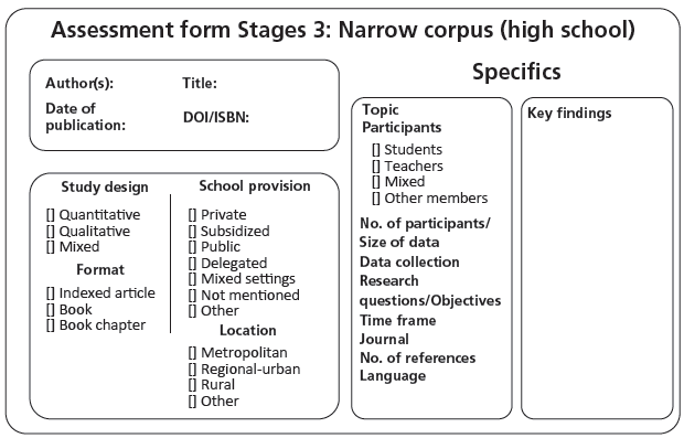 Some limitations encountered in the organization of studies were the oftentimes blurriness in the formalities, such as misleading titles, unclear abstracts, and an opaque research design missing relevant specification about the context and participants. Thorough examination of concepts was required in some articles describing “teachers’ beliefs” or “applied linguistics” to determine the study’s locus (not always explicit, e.g., either in schools or universities). Once the study’s setting was determined, the second filter (the focus) was applied. This focus consisted of discriminating studies based on their inquiry focus, that is, whether they reported sheer language analysis, or the analysis of a pedagogical situation embedded into a high school setting. In these cases, the latter case was selected for Stage 3.