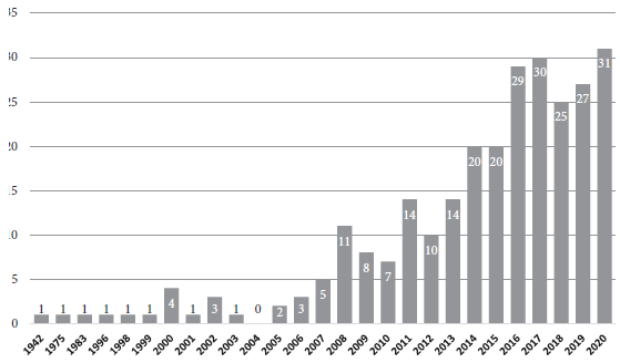 The spread shown in Figure 4 is the outcome of Stages 1 (the search) and 2 (the mapping). The spread shows the available online published English language research collected, ranging from 1942 to 2020. The numbers included in the bars represent the number of indexed publications, books, and book chapters. The findings show a gradually increasing production of scientific work in the field. This growth in publication coincides with other macro reports on research in Latin America, which also show a similar systematic expansion (Guzmán-Valenzuela & Barnett, 2019).