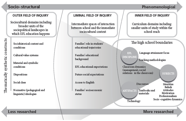 First, the outer field considers aspects of the sociopolitical world (Lo Bianco, 2008). This inquiry field is the least represented, and it consists of all the broader sociopolitical research areas that inscribe the normative, cultural, ideological, and social parameters, determining value systems and material and symbolic conditions in relation to EFL education. The findings reported in this field, as in Farías and Radu (2019) and Walczak et al. (2017), point to the correspondence between social class and language attainment opportunities and the sets of values that sustain the relations with English as a world dominant language. Nevertheless, EFL education is generally presented as detached from its sociohistorical conditions.