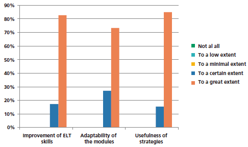Based on Figure 1, 84% of the teachers find the usefulness of the strategies in the modules as effective to a great extent, and only 15% view the strategies as effective to a certain extent. Improvement of ELT skills is another aspect that teachers consider effective (83%) to a great extent. The improvement can be attributed to the modules constructed and prepared to help teachers improve their pedagogical knowledge and abilities to develop students’ receptive and productive skills in learning EFL.