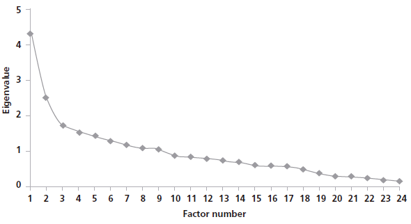 Table 3 verifies a good level of reliability for the questionnaire. Accordingly, the reliability of the items was .775, which is acceptable. Figure 1 confirms that nine factors were above one. Therefore, it can be concluded that the nine factors were extracted. In Table 4, the item’s loading factor is also provided.