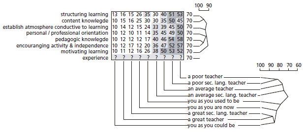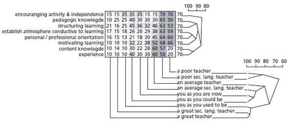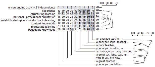 In the field of general education, there are numerous studies of teacher development and cognition based on repertory grid data. However, only a handful of investigations in the field of TEFL have utilized the RGT. One of the first of these was a study carried out by Bodycott (1997), who investigated conceptions of the “ideal teacher” among 12 preservice English language instructors in Singapore. The author supplied the grid elements, all of which were based on social and professional identities such as “self,” “past self,” “ideal self,” “mother,” “father,” “school principal,” and “language teacher.” Bodycott reported that the research participants’ opinions about “good” teaching emphasized the personal traits and values of language instructors rather than pedagogic knowledge.