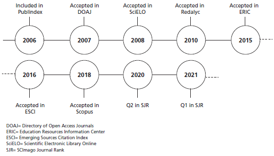 Profile has worked steadily to incorporate such standards and thus, has been accepted in several ranks, as shown in Figure 1, where we depict the journal’s timeline in its inclusion in databases and indexing systems.