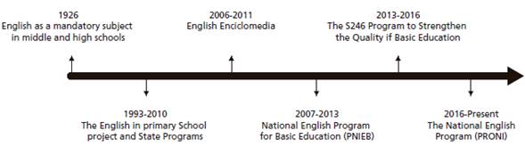In Mexico, English has been taught in secondary and high schools since 1926 (Calderón, 2015). Until the 1980s, many learners only had their first contact with the language when they started secondary education. This late exposure resulted in students’ low performance in the subject. In 1994, Mexico became a member of the North American Free Trade Agreement (NAFTA), which prompted new economical demands. The proficiency in English was perceived as pivotal for the required technological, economic, and industrial advances; thus, the Mexican government saw the urgency of introducing English in the elementary education curriculum. From then on, diverse national English programs have been issued, especially at elementary education, with the aim of tackling the challenges posed by the teaching of English in Mexico (see Figure 1).
