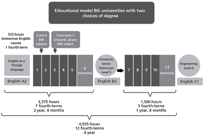 BIS universities work under a specific scheme as shown in Figure 2. Even though this program focuses on the provision of content through English, BIS universities first include an introductory term as several learners arrive with limited knowledge of the language. English allocation is at 100%, and the purpose is to help learners develop basic skills to comprehend content in English as of the next term. By the end, they will have taken 525 hours of English.