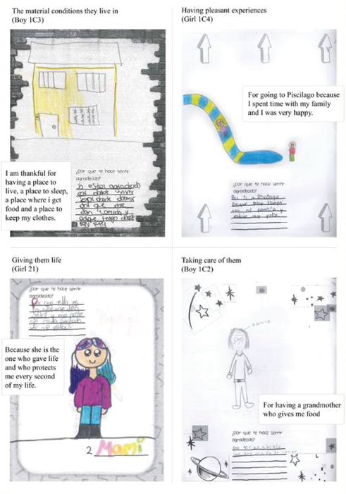 Indeed, the elements and themes of gratitude were present in all groups (both girls and boys, from both public and private schools) in rather similar ways. Moreover, the differences between groups were small and, in our analysis, were connected more to particularities of children’s lives than to general differences in gender or social class. For example, students from both public and private schools identified trips away from the city as a fun activity that made them feel grateful; the differences came in the types of places to which they travelled (to the coast by airplane, or to a nearby town by car or bus). Both girls and boys identified the nuclear family as a principal source of benefits. The differences came in the people who were mentioned as family members, relating to differences in the structure of each family. For example, there were several participants who mentioned living with a female head of household, others mentioned the stepfathers as a source of benefits, and still others being raised by their grandparents or living with their uncles or aunts, all of which are quite common forms of family structures in Colombia (Escobar, 2019).