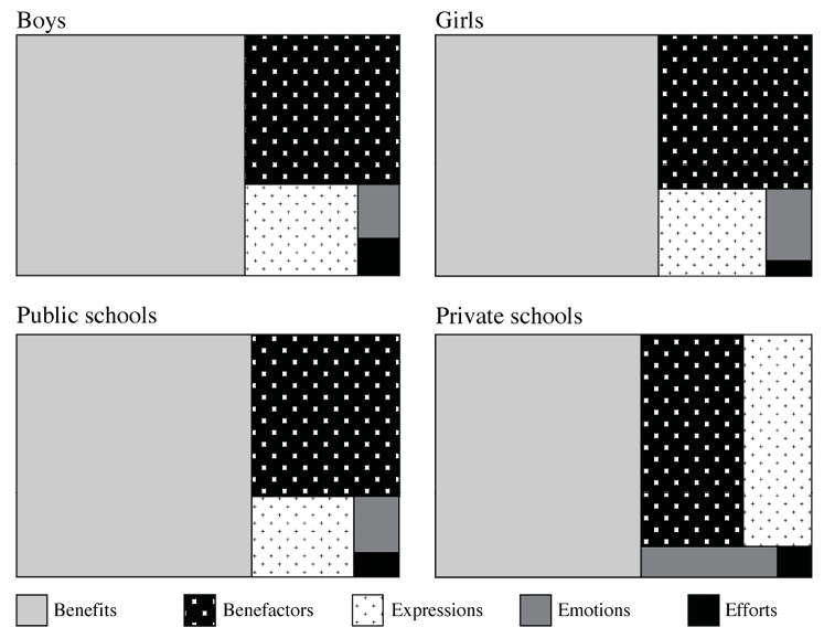 This analysis yielded two results. Firstly, differences were found in the descriptions of the themes of the unanticipated element of effort between the contexts of girls and boys and private and public schools, due to the different types of effort identified. Secondly, across all 4 contexts (girls, boys, public education, and private education) the 5 elements of gratitude and 26 of the identified themes and subthemes were present. Specifically, in the analyzed material for the girls, 84.6% of the identified subthemes were present, while for the boys 96.2% were present. Grouped by type of educational institution, 96.2% of themes and subthemes were identified in public schools and 84.6% in private schools. In all contexts, a wide diversity of benefits identified by girls and boys was observed, along with an impressive variety in the people and beings recognized as benefactors. All forms of expressing gratitude (verbal, concrete, connective, and finalistic) were also present. Two elements of gratitude showed less variety of examples across contexts: emotions and efforts. As mentioned above, the only differences in the presence of extracts between cases were due to the types of effort mentioned and certain benefits that were only mentioned by a single child. As can be seen in Figure 2, the saturation distribution of each element of gratitude was remarkably similar in each context.