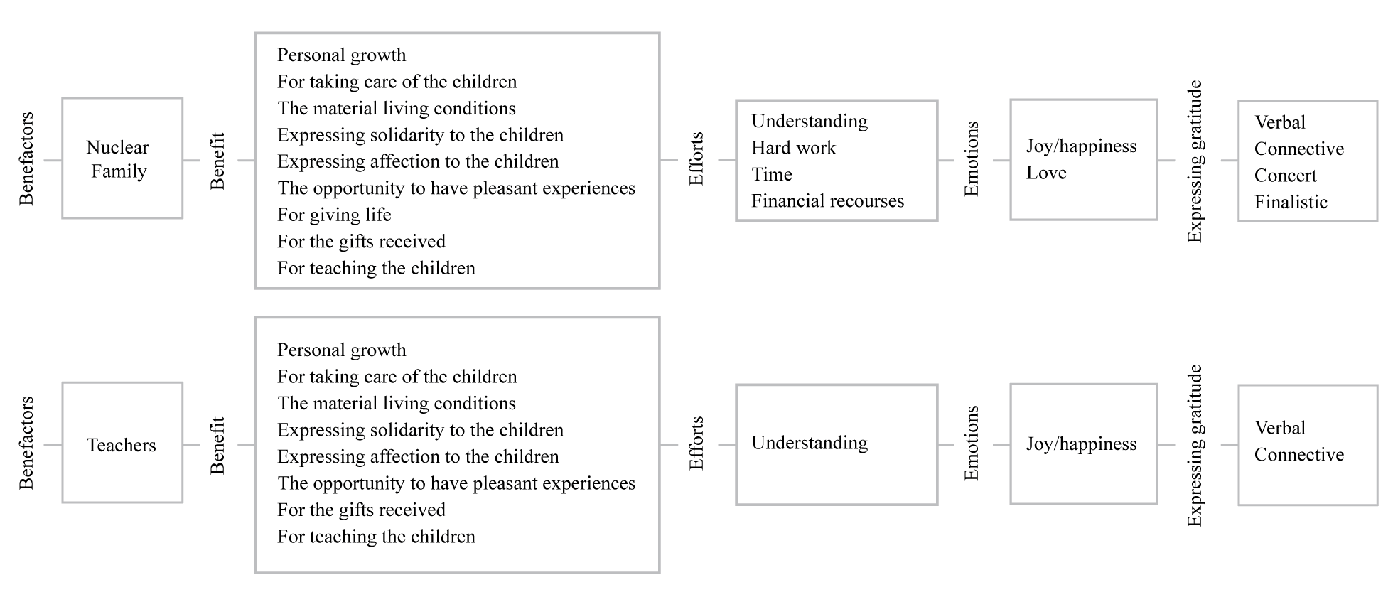 By way of synthesis, Figure 3 illustrates the connections between all these elements of gratitude, for the examples of nuclear family members and teachers.