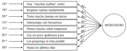 Por lo anterior, otra variable de interés en este estudio es la morosidad, la cual es definida por la literatura especializada en variables psicológicas asociadas al aprendizaje, como la disposición general a posponer o demorar la realización de actividades académicas (Aguilar, Valencia, Martínez, & Vallejo, 2002). Estos autores construyeron un modelo estructural de motivación intrínseca de estudiantes universitarios, en el cual la motivación intrínseca recibe un efecto directo y negativo de la morosidad y un efecto indirecto a través de la motivación de logro, y a su vez la morosidad es afectada por la autoeficacia y por el temor al fracaso.