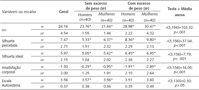 Com exceção da escala de autoestima, todas as demais variáveis mensuradas apresentaram diferenças significativas entre os grupos. O IMO médio dos participantes foi 26.16 e observou-se que ele foi mais baixo entre as mulheres sem excesso de peso e mais alto entre as mulheres com excesso de peso, as quais tiveram um IMO maior que os homens nessa condição. Já no que se refere à silhueta percebida, a média na escala de silhuetas foi de 7.47, enquanto na silhueta considerada ideal, o valor médio foi 5.97 (1.5 pontos de diferença). Há uma correlação positiva (r=.69; /K.001) entre o IMO e a silhueta percebida. Verificou-se que as mulheres tendem a escolher maiores silhuetas que os homens como as silhuetas atuais, o que também ocorre com a silhueta ideal escolhida, ainda que nesta a diferença seja menos evidente.