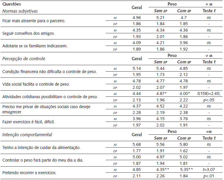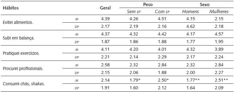 Notas: EP=excesso de peso M=média; DP=desvio padrão; * t(147.25)=2.40; p<.05.; **t(149.56)=2.49; p<.05.