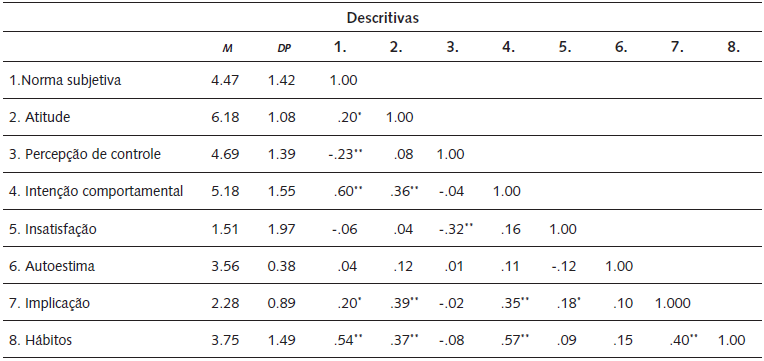 Para além de descrever as variáveis estudadas, objetivou-se propor um modelo preditivo capaz de explicar a intenção comportamental e a adesão aos comportamentos. A Tabela 4 apresenta os dados descritivos de cada uma das medidas utilizadas no modelo, assim como os valores de correlação entre eles. A atitude em relação ao controle de peso foi mensurada a partir de um item único do tipo diferencial semântico (com resposta em escala de sete pontos): No que se refere a controlar o peso, sou: contra (i) vs. a favor (7).