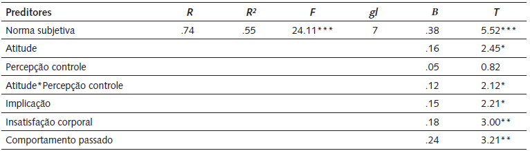 Um procedimento de regressão hierárquica múltipla foi realizado a fim de apresentar um modelo preditivo para a intenção comportamental, sendo inseridas oito variáveis preditoras: normas subjetivas, atitudes e controle comportamental percebido ante as práticas de controle de peso -variáveis clássicas do modelo do comportamento planejado (Ajzen, 1991)-, assim como o controle percebido como variável moderadora da atitude, a implicação, a insatisfação corporal e a autoestima. O modelo final mais parcimonioso indicado pelo menor valor de Akaike manteve sete variáveis preditoras, das quais seis apresentam poder explicativo à variável intenção comportamental, conforme elucida a Tabela 5.
