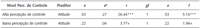 A partir desta análise de moderação, constatase que a atitude é um preditivo mais forte quando há alta percepção de controle. Em contrapartida, ela tem uma significância considerada marginal quando a percepção de controle é baixa. Tais resultados vêm a corroborar com a ideia de que as atitudes, sozinhas, não seriam bons preditores do comportamento, ou mesmo da intenção comportamental, embora não se possa negar sua contribuição dentro de modelos mais complexos na explicação do comportamento.