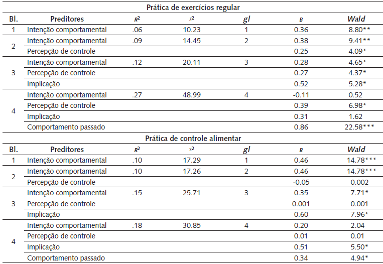 Num primeiro bloco, tanto para a prática de exercícios quanto para o controle alimentar, testou-se o poder preditivo da intenção comportamental, que foi significativo para ambos os comportamentos, porém mais forte preditor do controle alimentar (r2=.10; B=.46). No segundo bloco, foi adicionada a variável controle percebido, que, por sua vez, contribuiu apenas para predizer a prática de exercícios. O terceiro bloco teve a adição da variável implicação, que foi significativa em ambos e reduziu, em ambos os comportamentos, o poder explicativo da intenção comportamental. Por fim, adicionaram-se os hábitos (comportamento ao longo dos últimos três meses) no quarto bloco da análise de regressão e observou-se que estes são significativos para os dois modelos, em diferentes intensidades. No que se refere aos exercícios físicos, os hábitos mostraram-se os mais fortes preditores do comportamento, aumentando em mais do que duas vezes o poder preditivo do modelo de regressão.