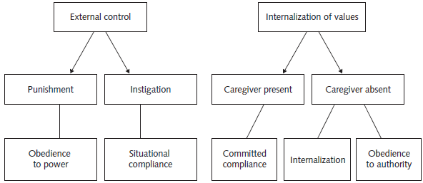 Figure 1 compares the different types of compliance that are presented here. They can be classified into two categories: (a) compliance that depends on external control and (b) compliance that is motivated by the internalization of norms or social values. Category (a) includes obedience to power and situational compliance. The difference between these two types of compliance is that the motivation for obedience to power is to avoid punishment, while situational compliance depends on continuous instigation by the caregiver and does not necessarily rest on the possible threat of punishment.