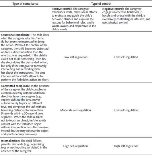 Several authors have used compliance and noncompliance behaviors to assess self-regulation in children, but few researchers have discussed the ways in which these behaviors impose different self-regulation demands in children. Compliance can be classified as situational compliance, committed compliance, internalization, obedience to power, and obedience to authority. Tis distinction considers differences in comprehending and internalizing parental expectations, the motivation of children to adjust their behavior to these expectations, and the children's ability to adjust their behavior with different degrees of independence. All of these are key elements in the self-regulation process, thus providing valuable information about self-regulation development in children.