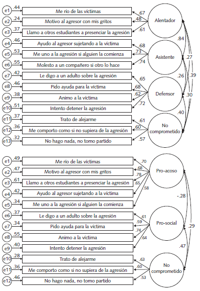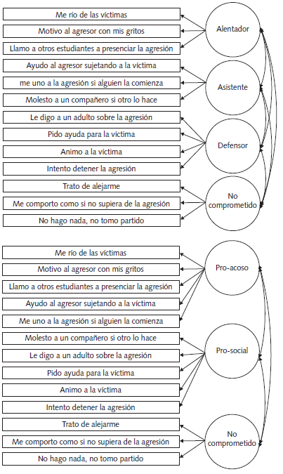 Se consideraron dos modelos de medida: (a) modelo 1 de cuatro roles: alentador, motiva al agresor a continuar con su conducta (por ejemplo, "me río de las víctimas"); asistente, no comienza el acoso pero apoya al agresor una vez que este inicia (por ejemplo, "ayudo al agresor sujetando a la víctima"); defensor, detiene la agresión o apoya a la víctima (por ejemplo, "animo a la víctima"); no comprometido, no toma partido por el agresor o la víctima (por ejemplo, "me alejo"). (b) Modelo 2 de tres roles: pro-acoso, conductas que apoyan y estimulan la conducta del agresor (por ejemplo, "ayudo al agresor sujetando a la víctima); prosocial, comportamientos dirigidos a proteger a la víctima (por ejemplo, "animo a la víctima"); y no comprometido, evitan involucrarse directamente (por ejemplo,, "Me alejo").