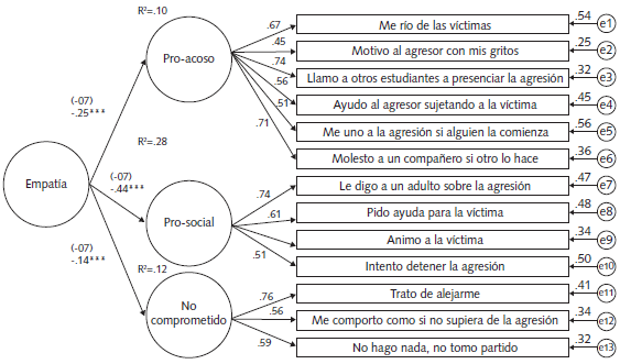 Los resultados mostraron que el modelo de relaciones entre empatía y los roles de espectador es empíricamente sustentable (x2=139.3, gl=92, p=.008; SRMR=.09; AGFI=.94; CFI=.97; RMSEA=.03 [.02,.04]). La empatía se relacionó negativamente con los roles proacoso (β=-.25) y no-comprometido (β=-.14) y positivamente con el pro-social (β=.44). De los resultados se infirió que el efecto más importante de la empatía se presenta en la conducta pro-social de los espectadores hacia las víctimas (Figura 3).