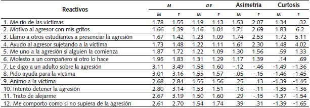 Media, Desviación Estándar, Asimetría y Curtosis por Sexo de los Reactivos de la Escala de Roles de Espectadores en el Acoso