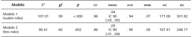 La diferencia en los valores de Chi-cuadrado entre ambos modelos (∆x 2 (1)=11.59, p<.000) resultó estadísticamente significativa, lo cual reafirma que ambos son modelos distintos de medición de los roles de espectadores. En ambos modelos los indicadores de ajuste son aceptables. Sin embargo, el modelo 2 (tres roles) presentó mejores índices de ajuste que el modelo 1 (cuatro roles) (Byrne, 2010; Kline, 2016; ver Tabla 2). En el modelo 2 todos los índices de ajuste fueron satisfactorios mientras que el modelo 1 presentó una probabilidad asociada a x 2 no aceptable. El valor de los índices de ajuste teórico AIC y BIC es menor en el modelo 2 con respecto al modelo 1, lo que sugiere mejor ajuste empírico en el primero (Kline, 2016).