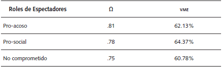 El análisis de la validez concurrente se realizó mediante el análisis de la relación de los roles de los espectadores con la empatía empleando el AMOS. Se evaluaron los índices de ajuste global del modelo x 2 con p > .001; CFI y AGFI ≥ .95; SRMR y RMSEA ≤ .05 y el valor y sentido de los coeficientes de determinación. Por último, se analizó la fiabilidad mediante la varianza media extractada (VME) y el cálculo de la consistencia interna de los puntajes con el coeficiente Omega de McDonald (Ω) dada la naturaleza ordinal de la escala. En lo relativo a la VME valores ≥ 50% se consideran aceptables, mientras que el valor Ω debe ser ≥ .70 (Zumbo, Gadermann, & Zeissen, 2007).