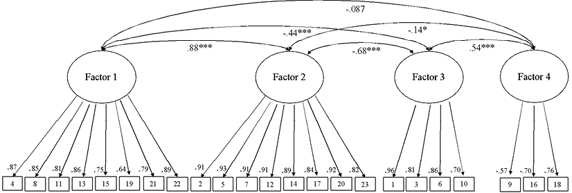 The fit quality results for the four-factor model were c2(224) = 496.158, p < 0.001, CFI = 0.963, TLI = 0.958, RMSEA = 0.048 (90% CI: 0.042-0.054). For the factor loadings, absolute values in the range 0.57 to 0.96 were observed, all statistically significant (p <0.001). Taken together, these results provide evidence regarding the adequacy of the four-factor model. The reliability Omega coefficients were: F1: 0.88; F2: 0.93; F3: 0.84; and F4: 0.63. The estimated parameters for this model are presented in Figure 1.