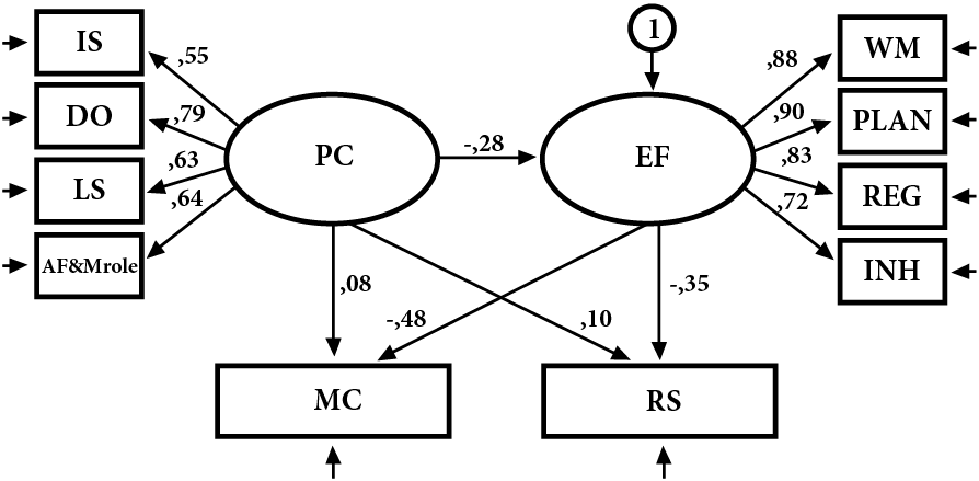 These results have theoretical, clinical, and psychoeducational implications. Theoretical, since they provide empirical data regarding the relevance of PCs for the development of EF and for academic task performance, as well as concerning the impact of EF on RS and MC. Clinical, because our results bring forwards the importance of early detection and approach to families in order to strengthen EFs and perform differential diagnoses. Finally, they constitute the basis for proposing interventions in parental strengthening programs during childhood.