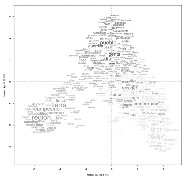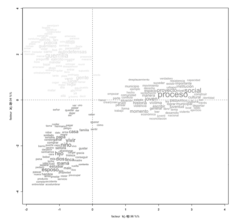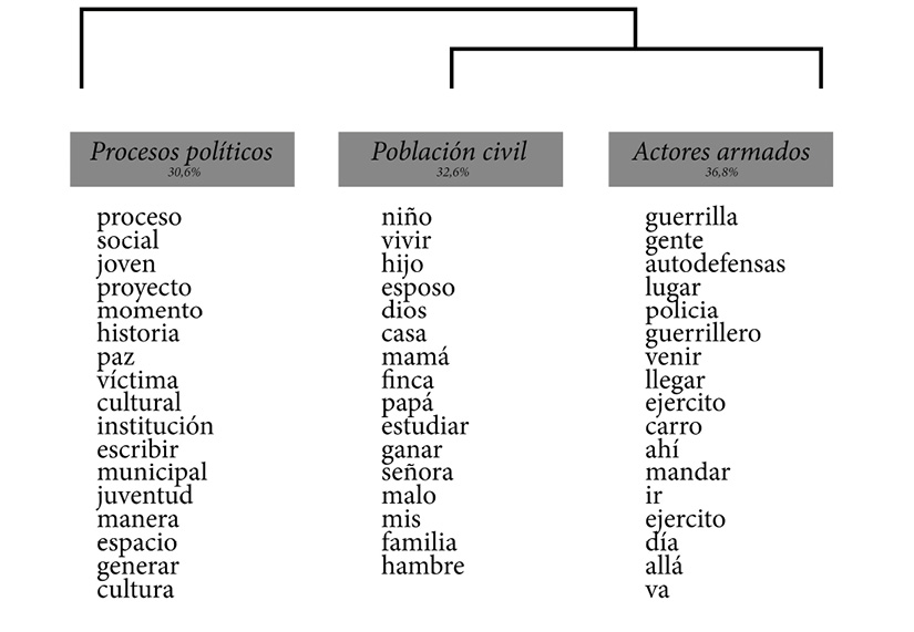 En el marco población civil, los términos se agruparon en condiciones propias del ser humano (humanidad), principalmente positivas y relacionadas con la pertenencia a una familia y a la sociedad. Diez palabras características de este marco fueron: niño, vivir, hijo, finca, esposo, mamá, ganar, papá, casa, Dios, ver. En el marco actores armados aparecieron grupos armados, tanto legales como ilegales, y algunas de las palabras características fueron: guerrilla, lugar, autodefensas, policía, gente, llegar, guerrillero, venir, ejército, mandar.