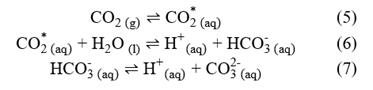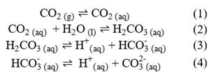 CO2 dissolves in seawater by a series of chemical reactions, which can be represented in equilibrium as shown below: