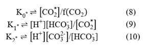Where f(CO2) is the fugacity of carbon dioxide in the gas phase; and K1*and K2* are the equilibrium constants that are often referred to as the first and second dissociation constants of H2CO3. Stoichiometrically, these equilibrium constants are functions of the temperature, pressure and salinity of the solution and have been defined at different pH scales (Zeebe & Wolf-Gladrow, 2001; Dickson et al., 2007; Millero, 2010). The square brackets represent the total stoichiometric concentrations of substances, denoted as moles per kilogram (mol/kg) of solution. The total stoichiometric concentration of a species is the sum of the concentrations of the free species itself, together with the concentrations of all complexes formed between that species and the ionic components of the medium (for seawater: H2O, Na+, Mg2+, K+, Ca2+, Cl- and SO4 2-) (Dickson et al., 2007).