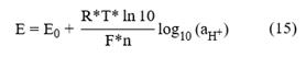 Where R is the universal constant of gases, F is Faraday's constant, T is the temperature (K), n is the charge of the ion, which in the case of the hydrogen ion is +1; E is the measured potential difference in the solution; E0 is a function of the binding potential EJ. Internal potentials and a series of unknown constants such as those linked to the construction of the electrode, being thus different in each manufactured equipment; and