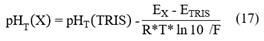 To obtain pH T in situ values, the expression of Bates & Guggenheim (1960) was used, in which the pH T of the sample X is related to that of the TRIS buffer through its potentials (all variables must be determined at the same temperature), such as follows: