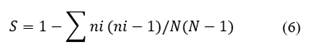 Simpson index (Eq. 6): Measures richness and dominance in a set of species (Somerfield et al., 2008).
