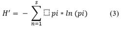 Where: s is the number of species per sample and pi is the ratio of individuals of species i to the total number of individuals (i.e. the relative abundance of species i). The higher the value of H', the greater the diversity of species.