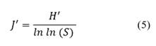 Pielou Equity Index (Equitability index, Eq. 5) which measures equity as a function of the number of species (Marrugan, 1988).