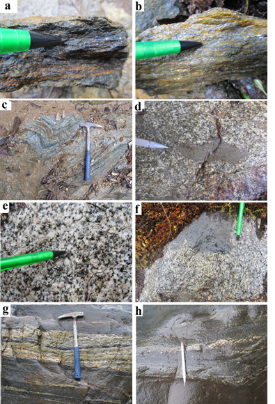 Figura 2: Aspecto macroscópico de unidades que hacen parte del Complejo La Cocha - Río Téllez. a) y b) Neis de Sibundoy: neis de cuarzo feldespato con biotita y moscovita; c) y d) Granodiorita de Motilón: roca de falla asociada a la Falla Afiladores y granodiorita con enclave de microdiorita; e) y f) Tonalita de Los Alisales: tonalita isotrópica y tonalita con enclaves de microdiorita ;g) y h) Anfibolitas del río Téllez: anfibolitas con bandas locales de granofelsa cuarzo feldespática.
