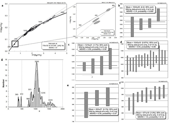 Los núcleos heredados dieron edades entre 1577±30 Ma (Mesoproterozoico) y 472,6±12,2 Ma (Neoproterozoico). En el análisis de las herencias se consideran los núcleos ígneos y metamórficos, mediante la información de las imágenes de CL y los valores de Th/U. Bajo el criterio anterior los núcleos ígneos arrojaron poblaciones de circones con edades promedio ponderadas de 1543±35, 1216±21 y 1043±10 Ma (Fig. 7) y 971±19 y 900±37 Ma (Fig. 7) y 472,6±12,2. El metamorfismo heredado está representado por un borde de sobrecrecimiento metamórfico con edad 206Pb/238U de 1050±44 Ma (Mesoproterozoico).