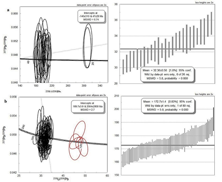 Para el cálculo de la edad de la muestra GR-7071 se descartaron 25 datos con valores discordantes >10%, discordancias negativas >5 y errores de edad corregida >5%. Se presentan dos datos concordantes, con edades de 20,9 Ma, que no representan una población. Nosotros creemos que estos dos datos podrían corresponder a intrusiones posteriores como venillas, que se observaron en la roca al momento de colectar las esquirlas y que se trató de apartar de las muestras, pero pudieron contaminar la muestra. La edad se obtuvo a partir de 26 datos que varían entre 30,1 Ma y 35,6 Ma y arrojó una edad promedio ponderada de 32,36±0,58 Ma (MSWD=5,8, n=26) (Fig. 9 a). La relación Th/U varía entre 0,37 y 1,8, típicas de circones de origen ígneo (Rubatto, 2002).