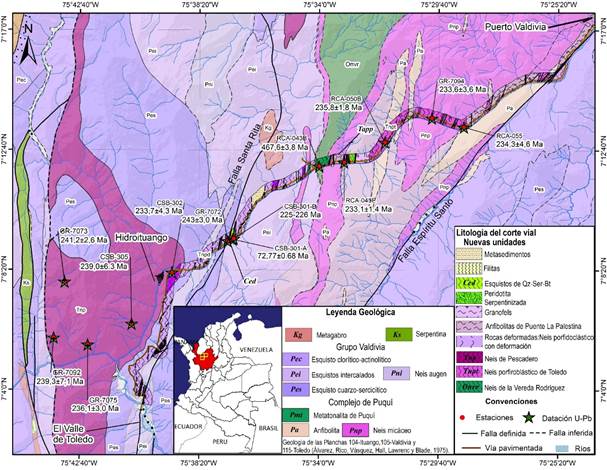 New U-Pb in zircon ages obtained in metamorphic units of the Puquí Complex and the Valdivia Group, from a sector in northwestern Antioquia, between the Central and Western Cordilleras of the Northern Andes, evidence three different regional geological events: 1) crystallization ages during the Ordovician (La Vereda Rodriguez Gneiss), comparable to ages obtained further east and south in the La Miel Gneiss and La Perla Gneiss; 2) Metamorphism and anatectic metamorphism during the Middle Triassic (Pescadero Gneiss, Toledo Porphyroblastic Gneiss, Puente La Palestiºna Amphibolites, and ages in deformed rocks), a regional event common to other gneissic bodies of the Central Cordillera in the Tahamí Terrane; 3) maximum Cretaceous depositional ages (ca. 72 Ma) in a biotite-moscovite-quartz schists unit, similar to those obtained in metamorphic and deformed rocks in the western margin of South America, and interpreted as a result of the collision of the oceanic Plateau against the continental margin. We propose a new nomenclature for previously mapped units within the Puquí Complex, such as the La Vereda Rodríguez Gneiss, the Toledo Porphyroblastic Gneiss, and the Puente La Palestina Amphibolites, based on geochronology results and existing mapping.