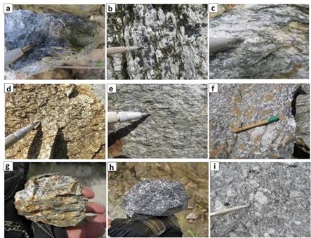 Figura 2: Características macroscópicas de rocas del Grupo Valdivia y el Compejo de Puquí. a y c) Neis de Pescadero, aspecto macroscópico de neis de cuarzo-feldespato-biotita-moscovita-granate ± zoisita ± clorita ± turmalina, b) Neis de Pescadero, diques de pegmatita con turmalina; d) cuerpos de neises deformados, neis porfidoclástico con deformación milonítica; e) esquisto cuarzo sericítico; f e i) Neis Porfiroblástico de Toledo; g) Neis de la Vereda Rodríguez; h) Anfibolita de Puente La Palestina.