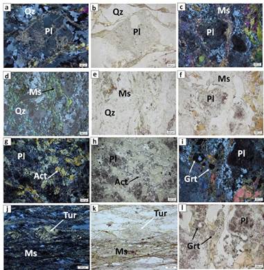 Figura 3: Características microscópicas de rocas del Grupo Valdivia y el Complejo de Puquí. a y b) nícoles cruzados y paralelos (Nx y Nll); aspecto microscópico del Neis de la Vereda Rodríguez; neis porfiroblásticos de plagioclasa-cuarzo-biotita-moscovita con turmalina; c, f, i y l) Neis porfiroblástico de Toledo; neis porfiroblástico de cuarzo-plagioclasa-moscovita-biotita y granate; d y e) (Nx y Nll) Neis de Pescadero; neises de plagioclasa-cuarzo-moscovita-clorita con zoisita y biotita; g y h) (Nx y Nll)Anfibolitas de Puente La Palestina, anfibolita: j y k) (Nx y Nll) rocas deformadas; neises porfidoclásticos de cuarzo-plagioclasa-moscovita con turmalina.