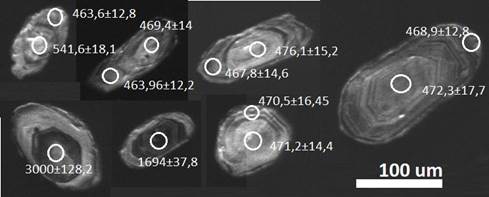 Figura 16: Imágenes de catodoluminiscencia de cristales de circón representativos de muestra RCA-055.
