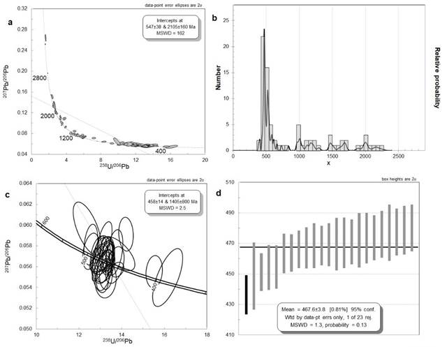 La muestra GR-7094 fue clasificada microscópicamente como neis porfiroblástico de Pl+Qz+Bt con Grt. Veinticinco cristales de circón fueron seleccionados, se realizaron 34 ablaciones y se descartaron un total de 15 análisis. Los datos aceptados (19) arrojaron resultados de 206Pb/238U entre 225,52±5,9 Ma y 372,8±10,4 Ma. Se presentan doce cristales, 7 con borde de sobre crecimiento metamórfico, 3 homogéneos metamórficos y dos núcleos con relación Th/U <0,2, que arrojan una edad promedio ponderada de 233,6±3,6 Ma, con MSWD=3 (n=12) (Fig. 9 a y b), la cual se considera la edad del último metamorfismo de la roca, con relaciones Th/U entre 0,07 y 0,52. Se obtuvo una segunda edad en bordes metamórficos de 247,6±6,6 Ma con MSWD=1,3 (n=4) y relación Th/U entre 0,03 y 0,14 que se interpreta como el primer metamorfismo de la roca. Además, se presentan 3 datos de herencias concordantes a 372,8±10,4 Ma y 322,36±8,7 Ma y 262,16 ± 9,97 que corresponden a núcleos ígneos (Fig. 9 c).