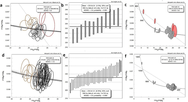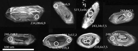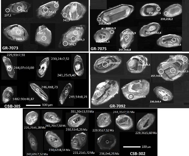 Cincuenta y tres cristales de circón se seleccionaron y se realizaron 66 ablaciones. Para el cálculo de la edad 206Pb/238U se eliminaron 27 datos con discordancias>10 y errores>5. Las edades obtenidas y aceptadas varían entre 233,6±7,5 Ma y 1233±32,35 Ma (Fig. 15 c). Se obtuvieron 21 datos, la mayoría en bordes de sobrecrecimiento metamórfico o metamorfismo anatéctico, que arrojan una edad promedio de 243,0±3,0 Ma, con MSWD=2,8 (Fig. 15 a, b) y relaciones Th/U entre 0,07 y 0,76, la mayoría de valores con Th/U<0,4. Se obtuvo una segunda edad en bordes de cristales de 270,9±7,3 Ma, con MSWD=2,2 que representan una edad heredada del Pérmico con relación Th/U de 0,06 a 0,89, puede corresponder a combinación de datos ígneos y metamórficos de acuerdo a la estructura de los circones y a los valores de Th/U. El resto de las edades heredadas se distribuyen entre 1233±32,35 Ma y 311,1±14,2 Ma, como se muestra en la Fig. 15 c.