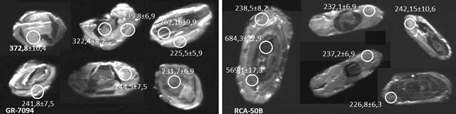 Figura 14: Imágenes de catodoluminiscencia de cristales de circón representativos de muestra GR-7072.
