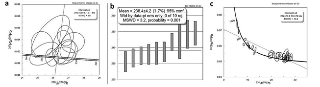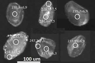 Sesenta cristales de circón se seleccionaron y se realizaron 101 ablaciones. Para el cálculo de la edad 206Pb/238U se eliminaron 59 datos con discordancias>10 y errores>5 y 10 circones discordantes en la concordia Tera-Wasserburg. Las edades obtenidas y aceptadas varían entre 225,87±7,52 Ma y 1063,68±29,25 Ma (Fig. 13 c). De acuerdo con los resultados se obtuvieron dos edades. La primera se obtuvo en dos bordes de sobrecrecimiento metamórfico con edades U-Pb de 225,87±7,52 Ma y 226,01±6,26 Ma, con relación Th/U de 0,03 y 0,02 y estarían representando la edad de metamorfismo de la roca. La segunda edad se obtuvo en circones de textura homogénea con leves zonaciones oscilatorias que arrojaron una edad promedio ponderada U-Pb de 238,4±4,2 Ma (Fig. 13 a, b), con MSWD=3,2 y relación Th/U entre 0,05 y 0,002 interpretada como edad de anatexia.